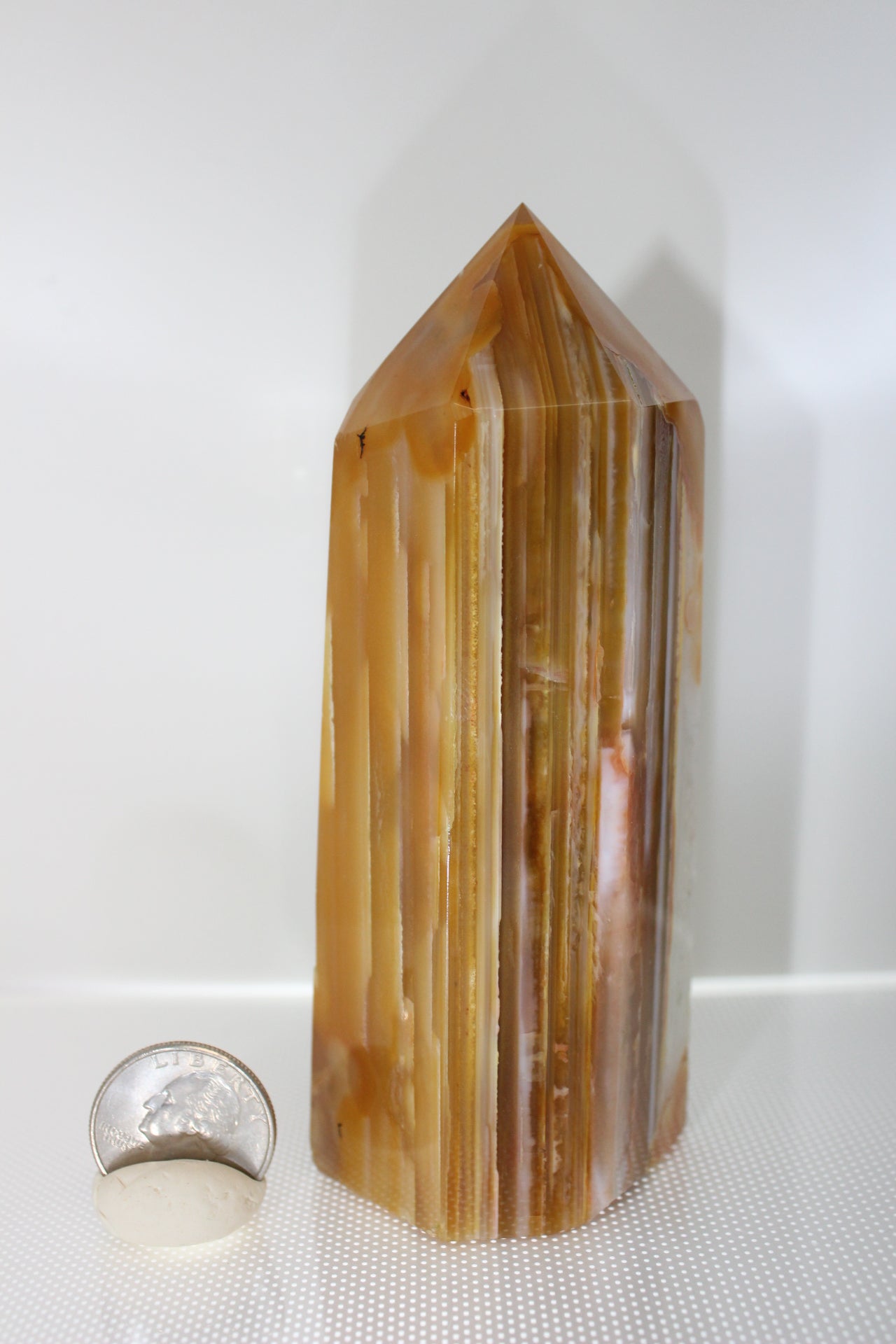 Here you are looking at an eye catching Carnelian tower that does have a lean. She stands 5 inches tall and is 2 1/4 in x 2 in weighing in at 1 lb 7.6 oz.